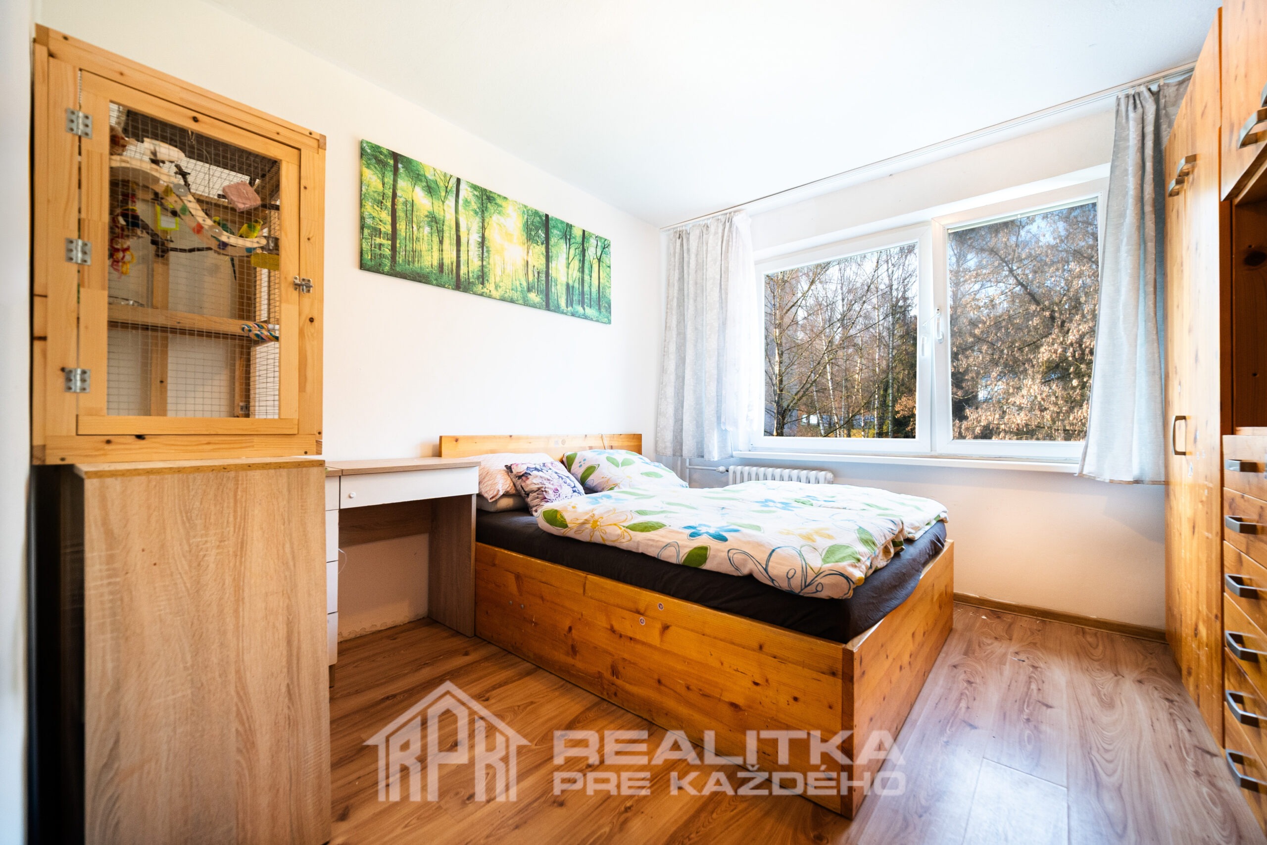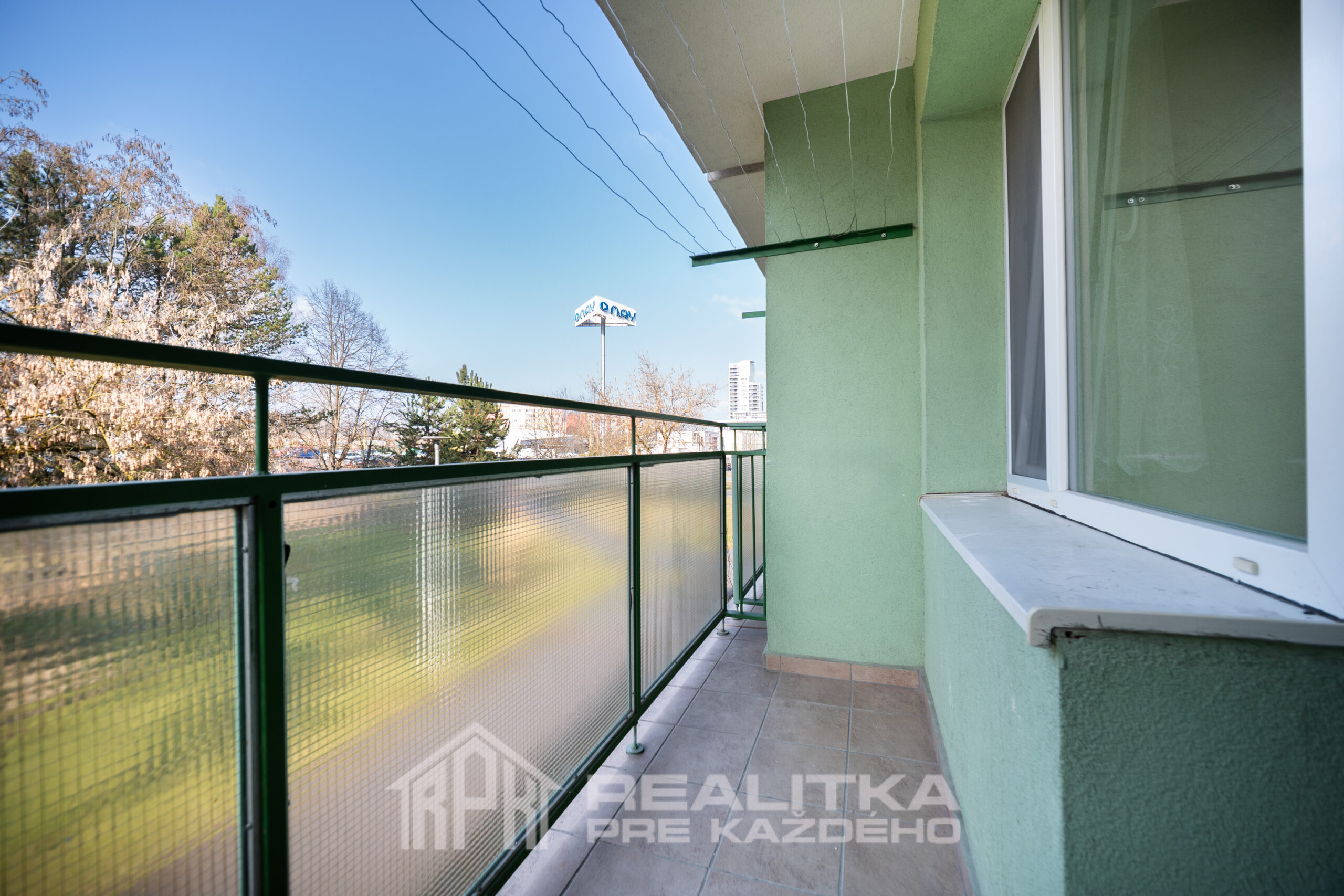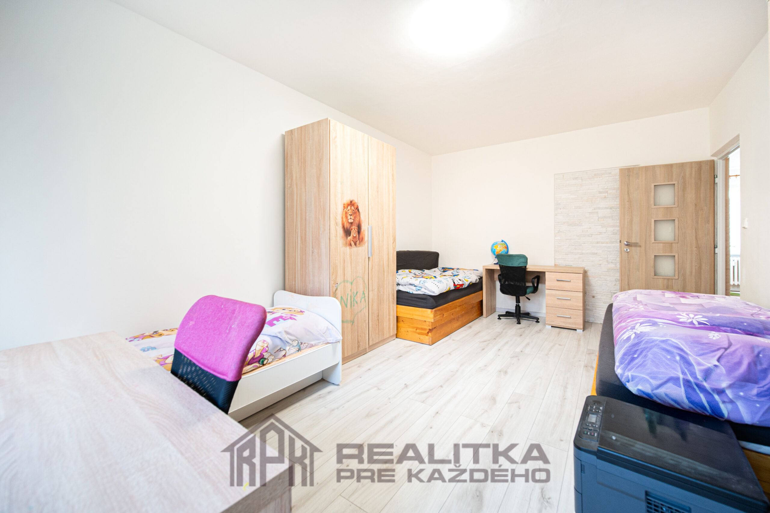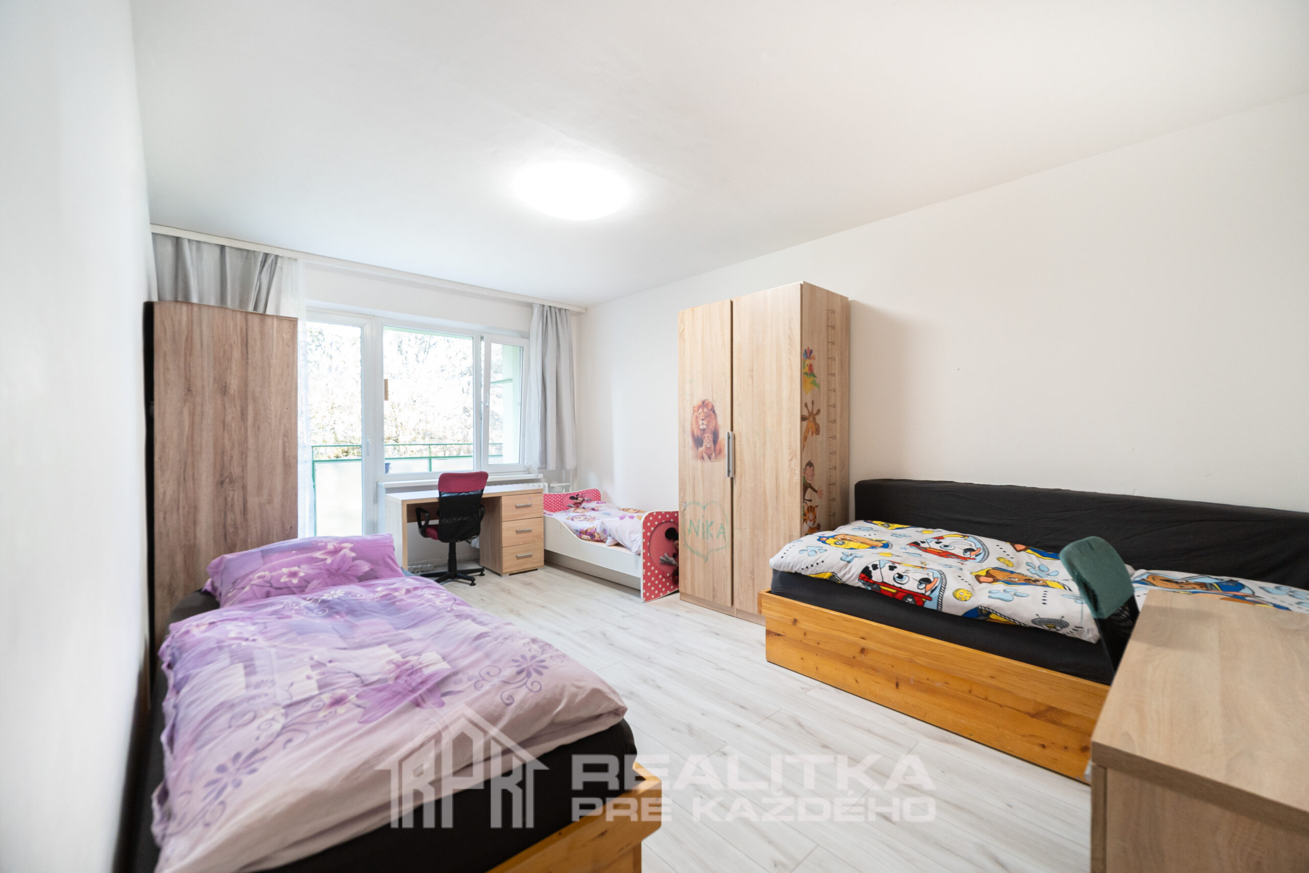 Dominantou bytu sú práve obývačka (15,94m2) a detská izba (18,65m2), z ktorej sa vychádza na loggiu (2,52m2). Ide o veľké vzdušné izby a práve vstup na loggiu ponúka pokoj a výhľad na peknú zeleň, ktorá sa nachádza za domom.
