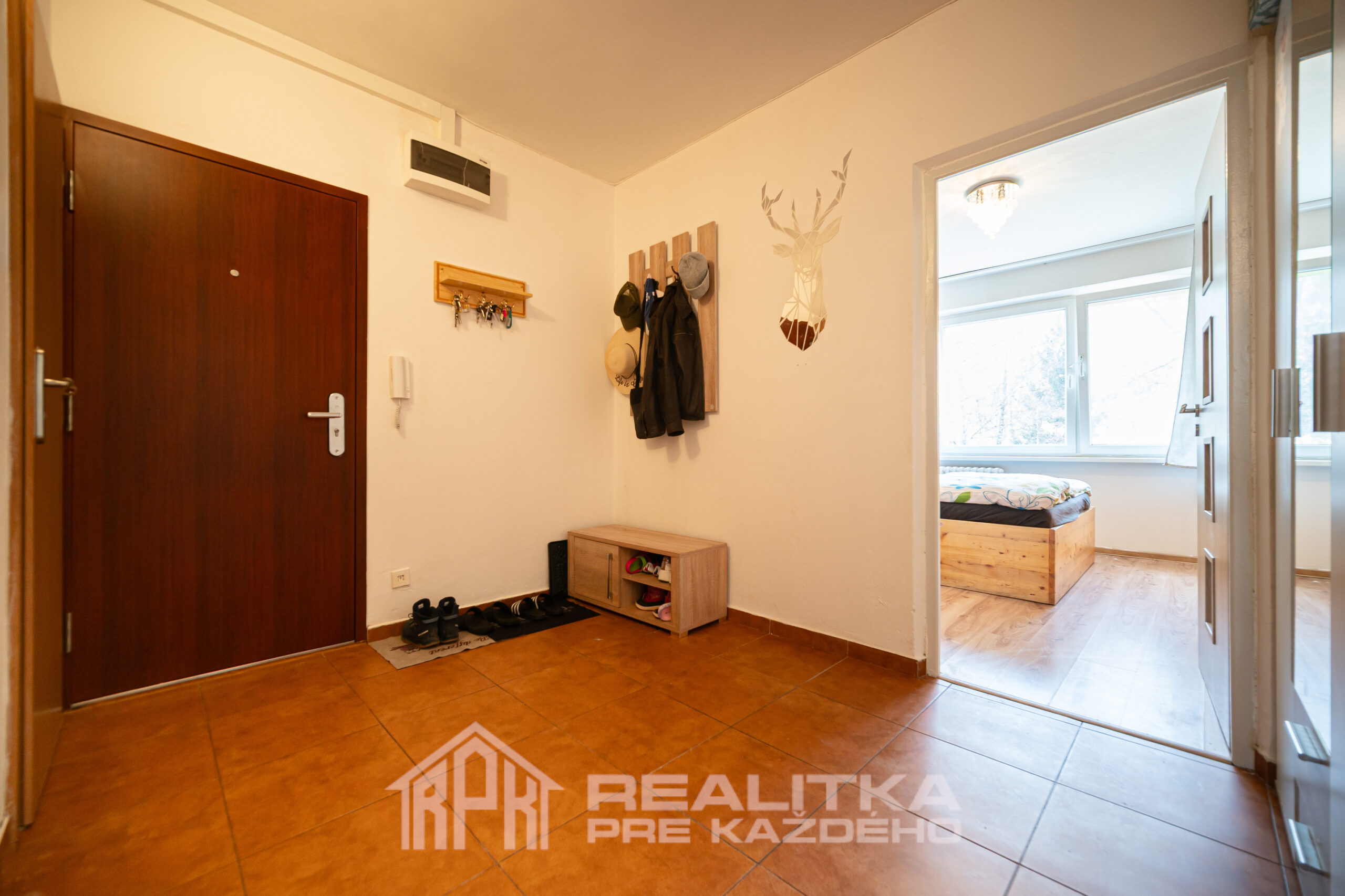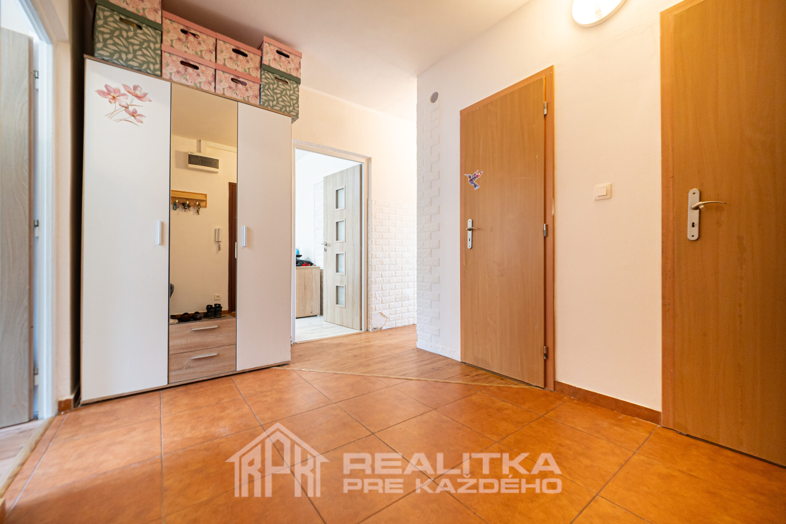 Po vstupe do bytu sa dostanete do chodby, z ktorej vedú dvere do kúpeľne a wc, detskej izby a spálne, pričom cez ďalšiu chodbu sa dostanete do kuchyne a obývačky.