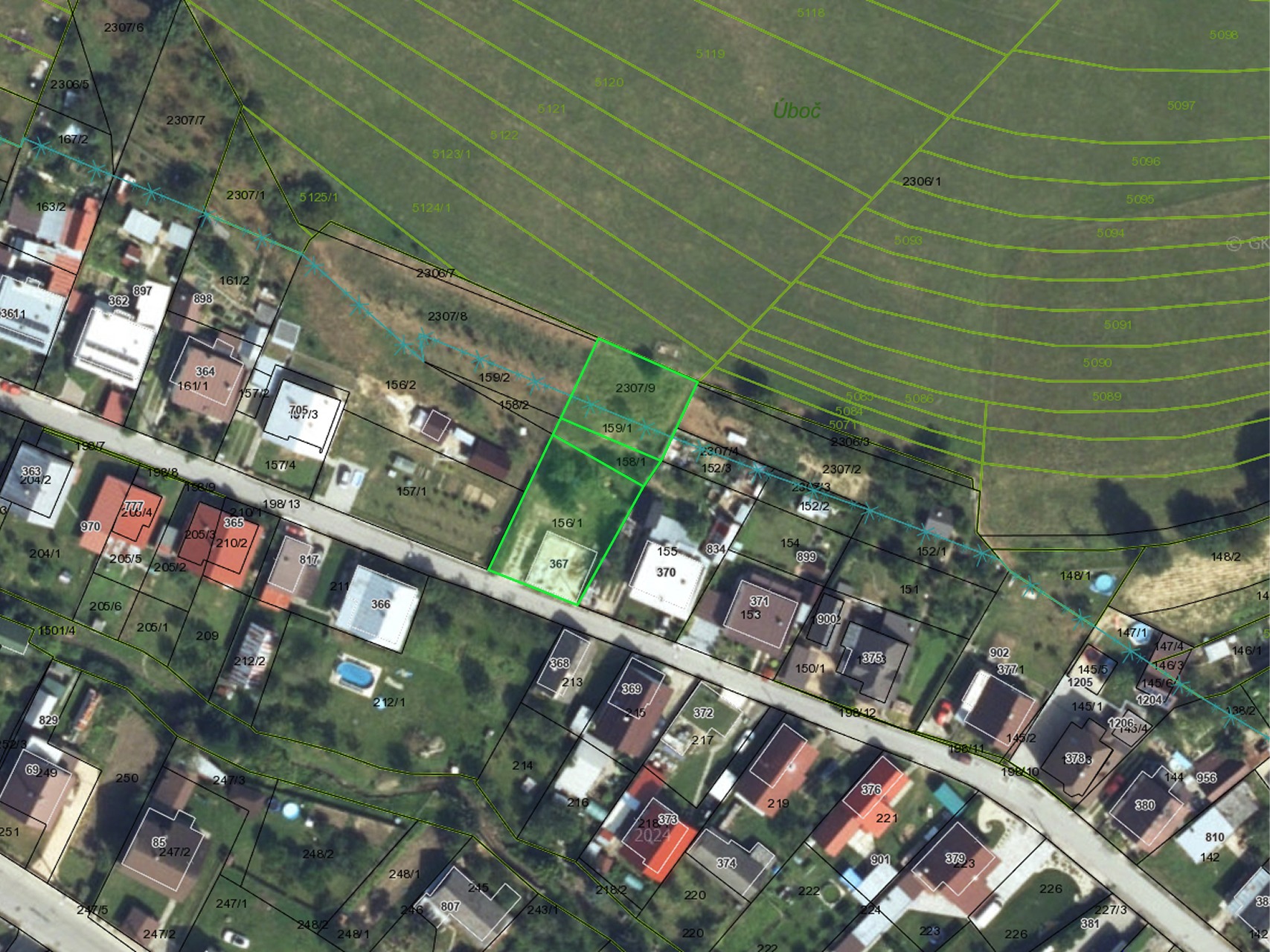 • Parcely: Pozemok sa skladá zo štyroch parciel s rozlohami 236m2, 96m2 89m2 a 499m2, čo spolu dáva 994 m2.